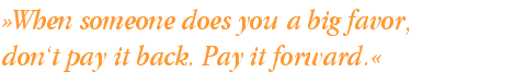 Diese Idee steht hinter dem Film »Pay it forward« (deutscher Titel: Das Glücksprinzip), der im Jahr 2000 in den USA gedreht wurde. Ich bin überzeugt davon, dass es möglich ist, den »Pay it forward«-Gedanken auch in der realen Welt zu leben. Die Umsetzung kostet kein Geld und sehr viel Mühe macht es auch nicht, einen anderen Menschen glücklich zu machen.
